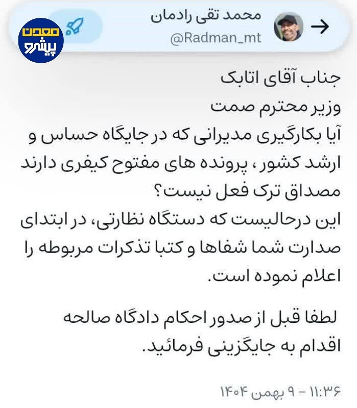 در این یادداشت که خطاب به جناب آقای اتابک، وزیر محترم صمت، منتشر شده، تأکید شده است: انتصاب و استمرار فعالیت چنین مدیرانی، بهویژه در شرایطی که دستگاههای نظارتی در ابتدای آغاز مسئولیت وزیر، تذکرات لازم را بهصورت شفاهی و کتبی اعلام کردهاند، میتواند مصداق ترک فعل تلقی شود.